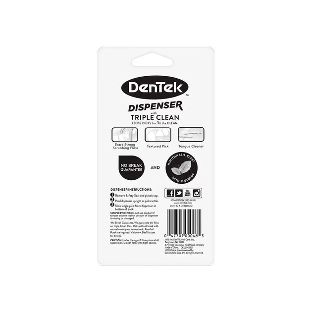 DenTek Потрійне очищення Флосс-зубочистки мають очищувальний флос з просунутим фторидним покриттям для видалення залишків їжі та нальоту, текстуровану зубочистку для глибокого очищення міжзубних проміжків та вбудований скребок для язика для підтримання свіжого. При використанні після кожного прийому їжі DenTek Потрійне очищення Флосс-зубочистки допомагають видалити залишки їжі та зубний наліт, зменшують ймовірність фарбування та руйнування зубів та допомагають усунути неприємний запах із рота.