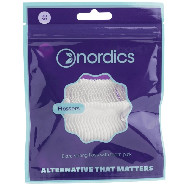 Флосери Nordics ідеально підходять для ретельного очищення зубів. Одна сторона оснащена зручним зубною ниткою для очищення міжзубних проміжків, а інша — загостреним кінчиком, який виконує функцію зубочистки. Флосери ідеальні для людей, що страждають на пародонтоз, гінгівіт, чутливість ясен або накопичення зубного каменю. Виготовлені з повністю перероблюваних матеріалів.