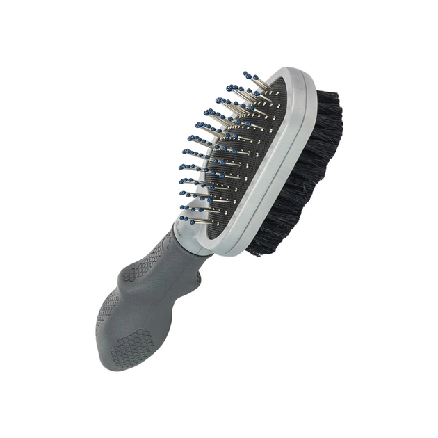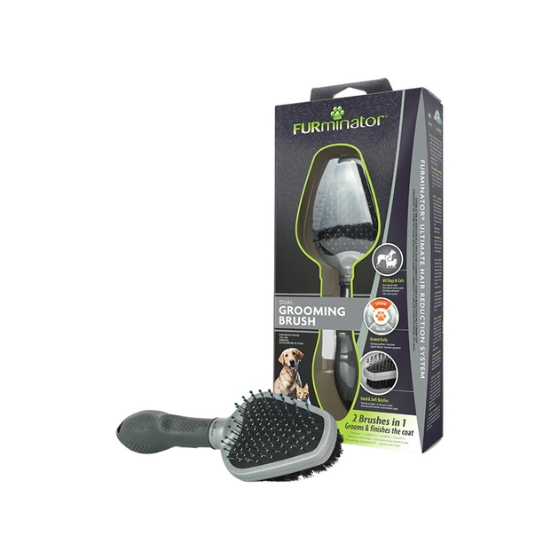 Двобічна щітка FURminator має два різні боки, які слугують різним цілям. З одного боку ви знайдете міцні жорсткі щетинки, які розплутують шерсть і допомагають видалити будь-який бруд, а також допомагають прочісувати сплутування. Інший бік зроблений з м'якої щетини кабана, яка допомагає зберегти природну гладкість і блиск шерсті. Ця щітка для кішок і собак має ергономічну протиковзну ручку, яка робить її зручною у використанні.
