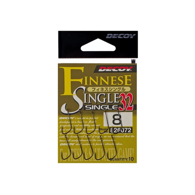 Гачок Decoy Single 32 призначений для оснащення силіконових принад при ловлі хижої риби. Що примітно, форма гачка була розроблена у співпраці з вітчизняними рибалками-спортсменами, які вважаються одними з кращих спінінгістів в світі. Правильно підібрана товщина дроту і особливий вигин, дозволяють приманці краще утримуватися на гачку і рибі значно складніше стягнути її. Також, така форма здатна витримати великі навантаження і менше схильна до розгинання. Single 32 має збільшене вушко для більшої свободи при здійсненні проводки.