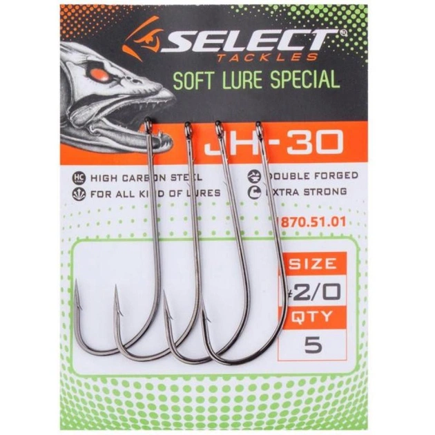 Гачок Select JH-30 застосовується для оснащення будь-яких, не надто об'ємних силіконових принад - черв'яків, твістерів і слагів. Великий одинарник краще засікає рибу в порівнянні з офсетними гачками. При цьому набагато легше уникає зацепів за підводні перешкоди, ніж подвійні і потрійні гачки.
