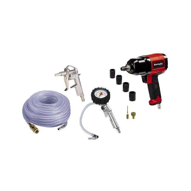 Професійний набір пневматичних інструментів Einhell з 10 предметів стане в нагоді для багатьох робіт вдома, майстерні, гаражі та у вільний час. Підходить для компресорів з робочим тиском мін. 8 бар. Пневматичний ударний гайковерт має макс. крутний момент 340 Нм. Продувний пістолет ідеально підходить для очищення поверхонь і робочих зон. Для перевірки тиску і накачування шин швидко підключається манометр. Користувач має величезну робочу зону завдяки 15-метровому повітряному шлангу з внутрішнім діаметром 9 мм. Крім того, повітряний шланг має швидкороз’ємну муфту для швидкої заміни інструментів.