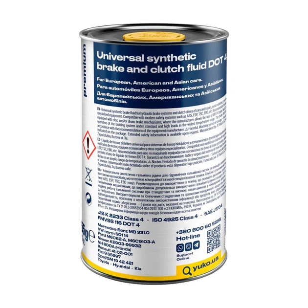 Універсальна синтетична гальмівна рідина Yuko ДОТ-4 для гідравлічних гальмівних систем та приводів зчеплення легкових та вантажних автомобілів, мототехніки, комерційної та іншої спеціалізованої техніки. Сумісна з сучасними системами безпеки типу ABS, ESP, TSC, EBD тощо. Рекомендована до використання в техніці, що оснащена дисковими та/або барабанними гальмівними механізмами, де виробником допускається використання гальмівної рідини стандарту DOT 4. Забезпечує надійну роботу гальмівної системи при стандартних та високих навантаженнях у найширшому діапазоні температур.