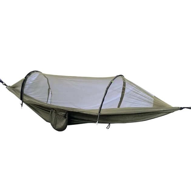 - Міцні сталеві каркасні дуги забезпечують стабільність конструкції, утримуючи сітку в піднятому положенні та збільшуючи простір усередині гамака.