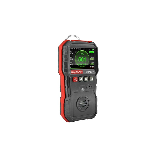 Аналізатор газів WINTACT WT8807 призначений для визначення концентрації вуглекислого газу СО2 в навколишньому просторі. Вимірювальний прилад дозволяє не лише аналізувати та одночасно відображати на екрані поточний рівень СО2, а й сигналізувати перевищення заданих меж концентрації. Крім цього, виміряні параметри можуть бути збережені в пам'яті пристрою з заданим інтервалом. Цей портативний прилад буде незамінним для проведення санітарного контролю повітря на хімічних підприємствах, об'єктах ЖКГ, при обслуговуванні технологічних колодязів, на металургійних підприємствах і т. д. Особливості та переваги WT8807: