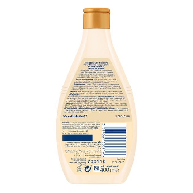 Гель для душу Johnson's Vita-Rich Релаксний з йогуртом, кокосом і екстрактом персика 400 мл (3574661385716)