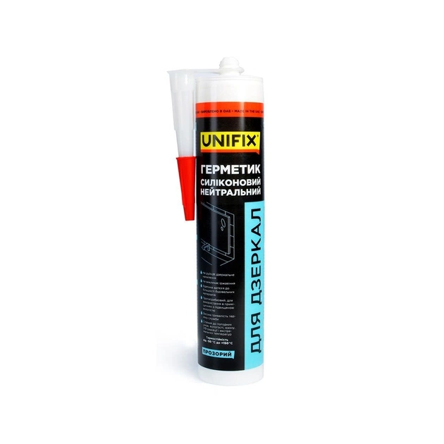 Unifix - Однокомпонентний універсальний силіконовий кислотний герметик, що твердіє при взаємодії з вологою при кімнатній температурі і формує гнучкий еластичний продукт. Широко застосовується в будівництві і склінні. Легко наноситься і забезпечує відмінну адгезію до непористих поверхонь, таких як скло. Стійкий до озону, УФ-радіації і екстремальних температур. Призначений для використання зі спеціальним пістолетом для герметиків.