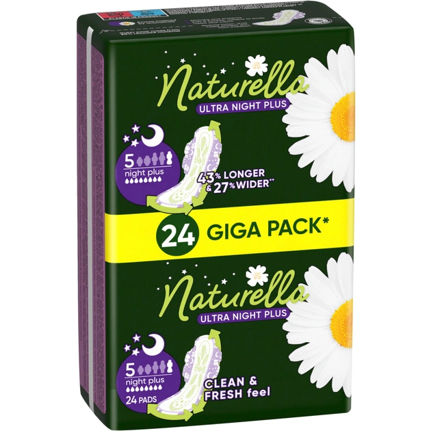 Naturella Ultra Night Plus на 43% довші і на 27% ширші* для кращого захисту вночі (порівняно з Naturella Ultra Normal).