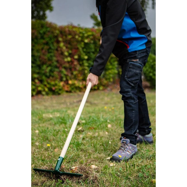 Граблі універсальні прямі, 14 зубців, клепана головка, дерев'яна ручка 15G057 від VERTO - це граблі з 14 практичними зубцями, розташованими на клепаній головці. Дерев'яна пряма ручка забезпечує зручність використання. Граблі марки VERTO характеризуються загальною довжиною 1400 мм і вагою 1,4 кг. Рекомендуються для багатьох застосувань.