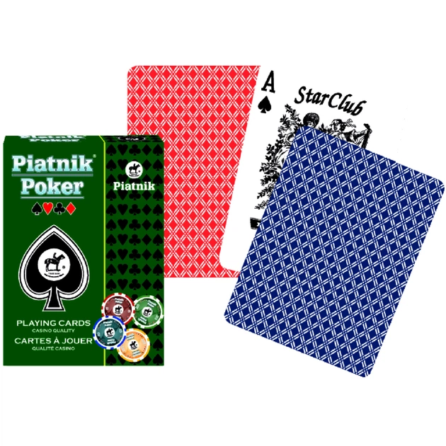 Гральні карти Piatnik - стандартна колода, яку можна використовувати для будь-яких карткових ігор. Карти виготовлені з високоякісного картону з ламінуванням. Ламінування покращує ковзання та довговічність карт. Сорочка - може бути в червоних або синіх тонах. Розмір карт стандартний, вони ідеально підходять для будь-яких карткових ігор. Колода складається з 52 основних карт, 2-х джокерів та промокарти.
