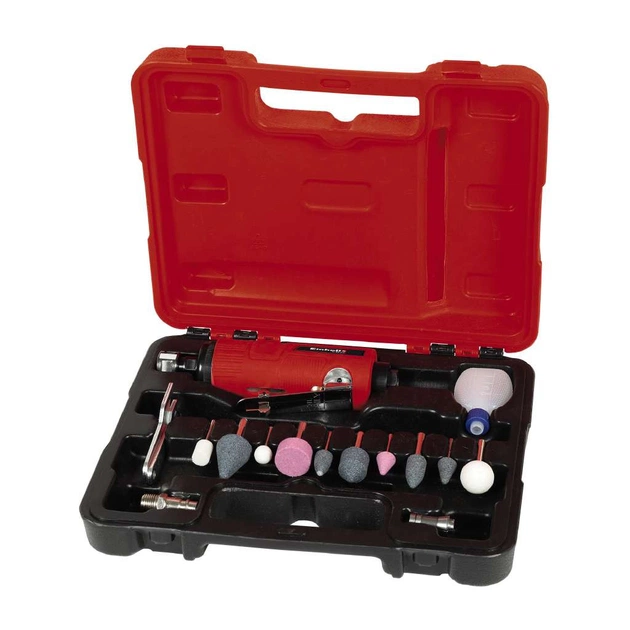 Пневматичний прямий гравер Einhell TC-PP 220 — це зручний інструмент для використання вдома, на робочих майданчиках або в гаражі. Для безпечної роботи гравер має неслизьку прогумовану ручку. Цей потужний прецизійний інструмент зі швидкістю обертання до 22000 об./хв дуже допомагає під час шліфування, полірування, гравіювання та видалення задирок. Найкращі результати роботи досягаються під час використання шланга з внутрішнім діаметром не менш ніж 9 мм. Гравером зручно працювати однією рукою. Важіль спускового гачка запобігає ненавмисному пуску. До комплекту постачання входить набір з 10 шліфувальних насадок. Також у комплекті є 1 невелика пляшка для олії, 1 ніпель і 2 комбіновані ключі для зміни приладдя. Гравер постачається в практичному пластиковому кейсі для транспортування й зберігання.