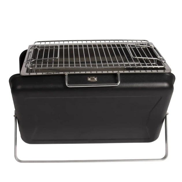 Гриль складається з розкладного каркаса-валізи та гриля-вкладиша з нержавіючої сталі з решіткою. У складеному стані його дуже зручно переносити за ручки, а всі деталі, які контактують із деревним вугіллям і можуть бути закопчені, укладаються всередину каркасу. Отже його сміливо можна покласти в багажник автомобіля до інших речей, не боячись їх забруднити. Для приготування смачного шашлику або овочів на грилі вам знадобляться лише вугілля та щипці для перевертання. Немає потреби брати із собою додатково шампури чи решітку.