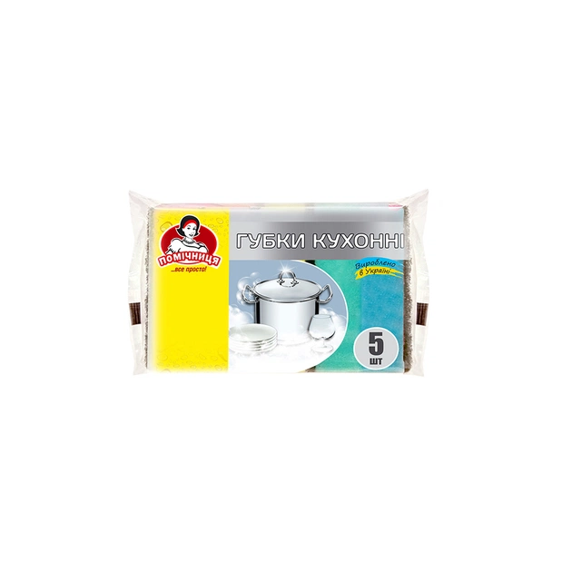 Кухонні губки Помічниця забезпечують якісне прибирання та догляд за поверхнями. Використовується разом з мийними засобами або без них. Мають різноманітну колірну гаму. Висока щільність поролону сприяє тривалому використанню губки. Шорсткий шар губки (фібра) сприяє жорсткому впливу на поверхню посуду, очищає сильно забруднені частини без пошкоджень посуду.
