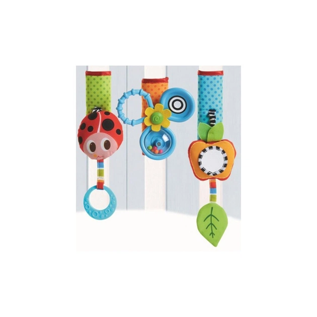 Особливості: легке кріплення до ліжечок і до бампера дитячої коляски за допомогою регульованих липучок; розвиток дрібної моторики дитини; різні ігрові елементи: деренчливе Сонечко з гризунком, Яблучко-дзеркальце з прорезувачем, Квітка-Пропелер.