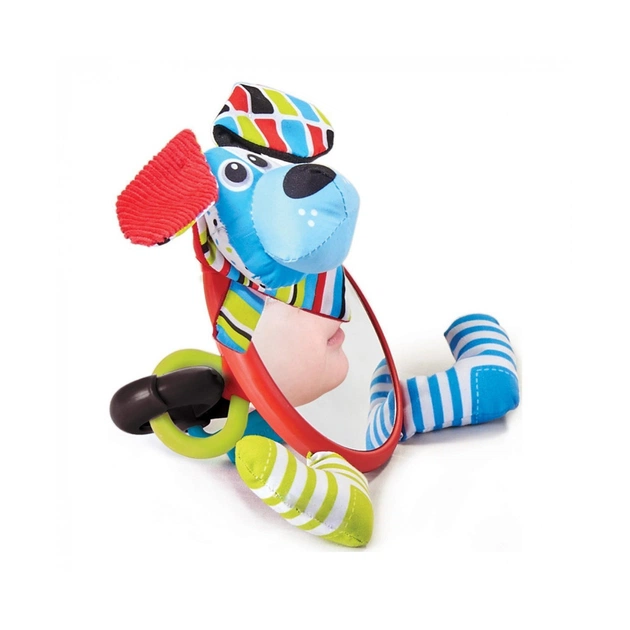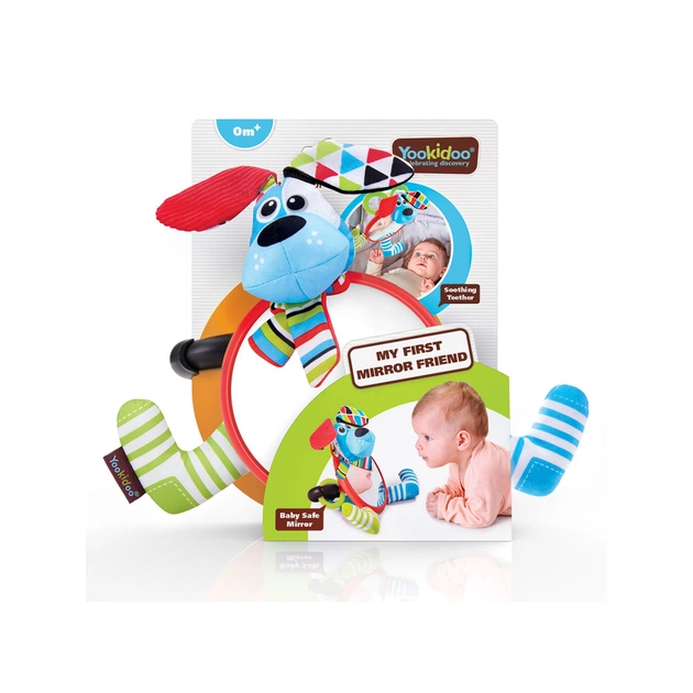 Іграшка на коляску Yookidoo Моє перше дзеркальце Собачка — корисна та цікава іграшка для малюків. З її допомогою дитина зможе самостійно розвивати зорову реакцію, концентрувати свою увагу на певних деталях, вивчати своє зображення, а також тактильне відчуття завдяки різній структурі тканин.