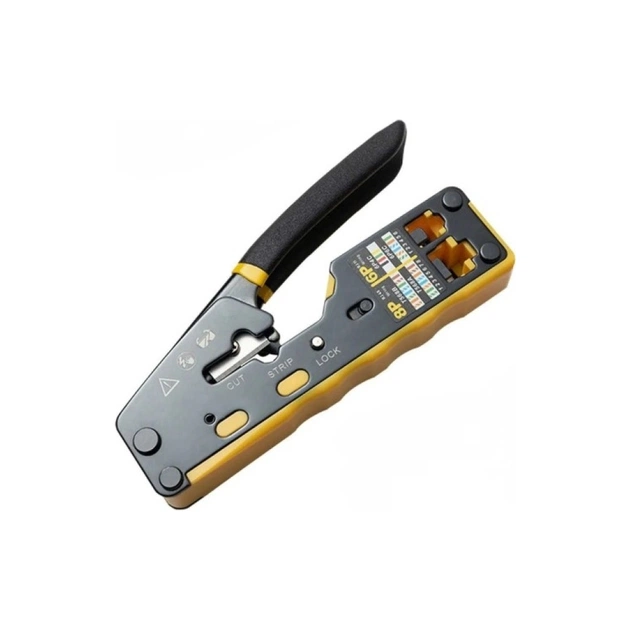 Ручний інструмент для обтискання UTP/STP прохідних конекторів 8P8C/RJ45, а також для телефонних 6P6C/RJ12 та 6P4C/RJ11. Інструмент може бути використаний і для обтиску стандартних ненаскрізних роз'ємів RJ45. У корпус інструменту вбудований різак для обрізання кабелю, і "стрипер" для зачистки, зняття ізоляції. У конструкції передбачено наявність блокування, для зручного зберігання та транспортування. Корпус виконаний із сталі та пластику, у двоколірному виконанні, більш помітний жовтий та чорний.