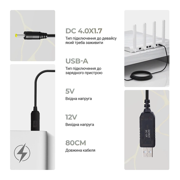Кабель для роутера працює практично від будь-якого повербанка, навіть від того, що не має швидкої зарядки, оскільки шнур містить вбудовану плату, що підвищує напругу до 12 вольт.