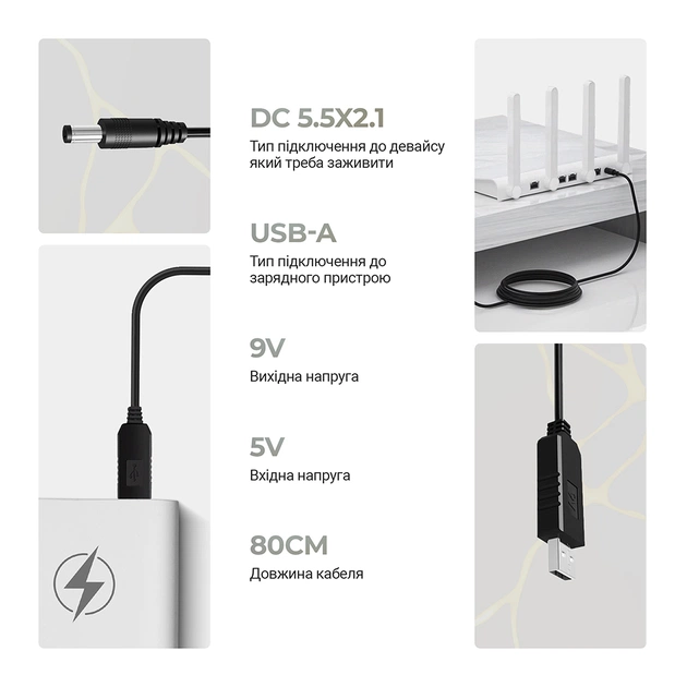 Кабель для роутера працює практично від будь-якого повербанка, навіть від такого, що не має швидкої зарядки, оскільки шнур містить вбудовану плату, що підвищує напругу до 9 вольтів.