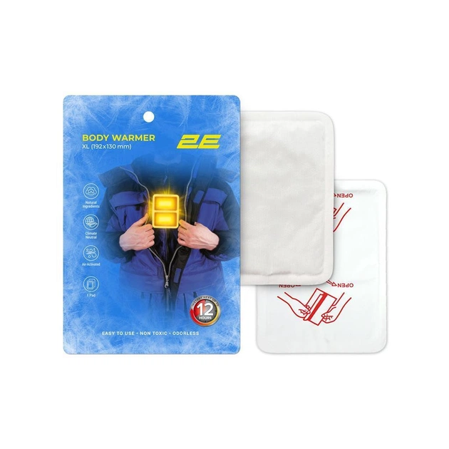 Грілка для тіла 2E Легка у використанні – Не токсична – Без запаху. Активується повітрям. Природне тепло до 12 годин. Просто відкрийте упаковку, вийміть грілку та зачекайте кілька хвилин для активації киснем. Покладіть грілку в кишеню, під куртку або в інше місце, яке потрібно зігріти. Після одноразового використання утилізуйте охолоджену грілку в якості звичайного сміття.