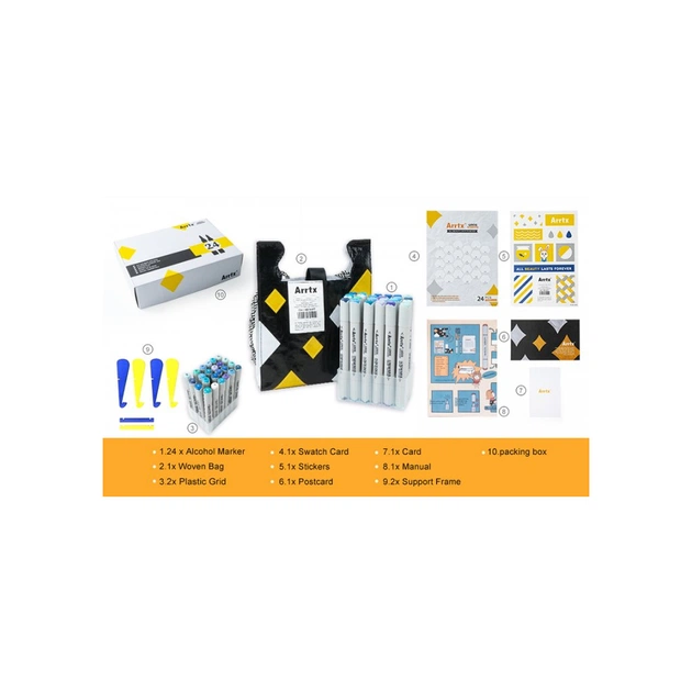 Комплектація: 24 маркери. Ткана сумка. Пластикова сітка. Картка для зразків кольорів. Стикери. Листівка Підставка. Коробка для зберігання й перенесення.