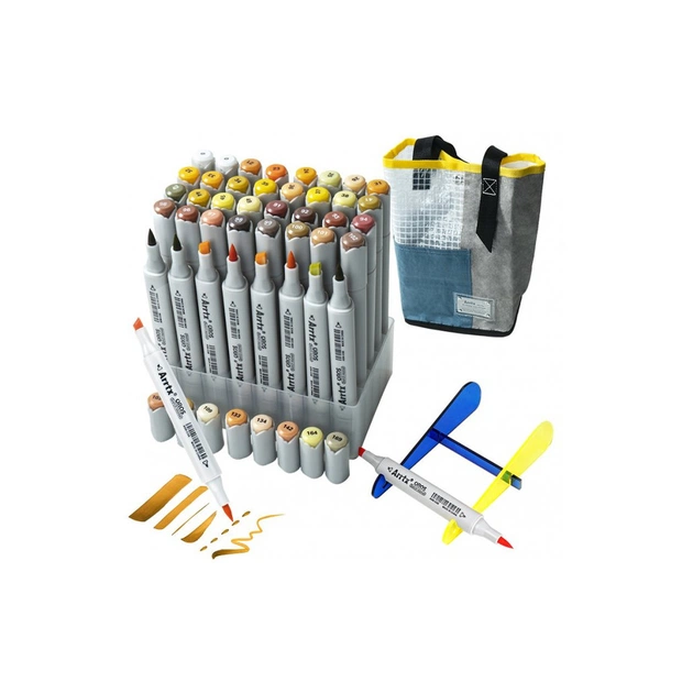 Комплектація: 40 маркерів. Ткана сумка. Пластикова сітка. Картка для зразків кольорів. Стикери. Листівка Підставка. Коробка для зберігання й перенесення.