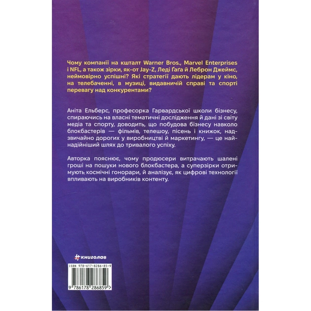 Аніта Ельберс, експертка Гарвардської бізнес-школи з індустрії розваг, проводить новаторські дослідження у світі медіа та спорту вже більше десяти років. У своїй книзі вона пояснює важливу правду про жорстку конкуренцію у світі бізнесу навколо блокбастерів — фільмів, телевізійних шоу, пісень і книг, виробництво та збут яких надзвичайно дорогі.