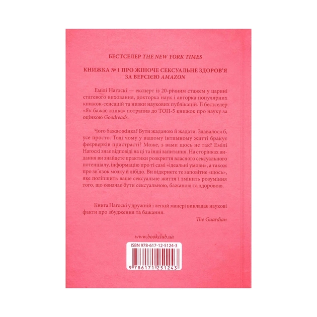 Емілі Наґоскі знає відповіді на ці та інші запитання. Про всі «секретики» і «точки» жіночого тіла, про сексуальне бажання, механізм його дії та ідеальні умови для його пробудження. На сторінках видання ви знайдете практики розкриття власного сексуального потенціалу, інформацію про ті самі «ідеальні умови», а також про зв'язок мозку й лібідо. Історії реальних жінок, їхні запитання й відповіді на них поряд із результатами досліджень кваліфікованих фахівців... Ви відкриєте те заповітне щось, яке поліпшить ваше сексуальне життя і змінить розуміння того, що означає бути сексуальною, бажаною та здоровою.