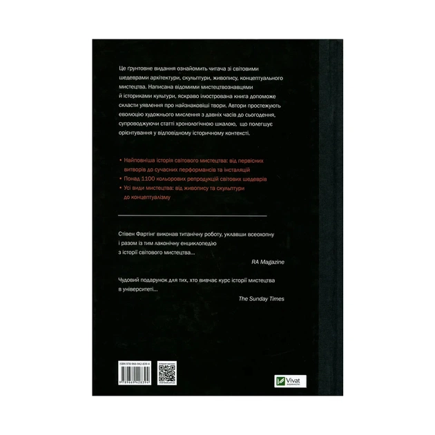 Це ґрунтовне видання ознайомить читача зі світовими шедеврами архітектури, скульптури, живопису, концептуального мистецтва. Написана відомими мистецтвознавцями й істориками культури, яскраво ілюстрована книга допоможе скласти уявлення про найзнаковіші твори. Автори простежують еволюцію художнього мислення з давніх часів до сьогодення, супроводжуючи статті хронологічною шкалою, що полегшує орієнтування у відповідному історичному контексті.