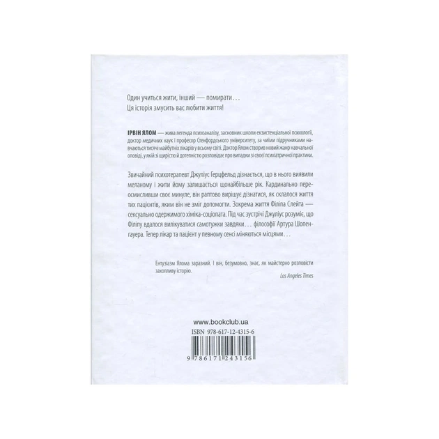 Ірвін Ялом - жива легенда психоаналізу, засновник школи екзистенціальної психології, володар Oscar Pfister Award за внесок в релігію та психіатрію, доктор медичних наук і професор Стенфордського університету, за чиїми підручниками навчаються тисячі майбутніх лікарів у всьому світі. Доктор Ялом створив новий жанр навчальної оповіді, у якій зі щирістю й дотепністю розповідає про випадки зі своєї психіатричної практики.
