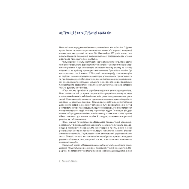 Як з’явилося і еволюціонувало кіно? Як воно відзеркалює наші страхи і мрії, а також впливає на масову свідомість? Як працює сучасна кіноіндустрія? І які професії необхідні у кіновиробництві? Про усе це та багато іншого розповість «Твоя книга про кіно» від Ольги Бірзул, кураторки кінопрограм і культурної менеджерки. Та ще й порекомендує цікаві фільми до перегляду й розкаже, як створити власні колекції улюблених стрічок. Ця книжка точно прокачає ваші глядацькі навички та емоційний інтелект, надихне довідатися про кіномистецтво більше!