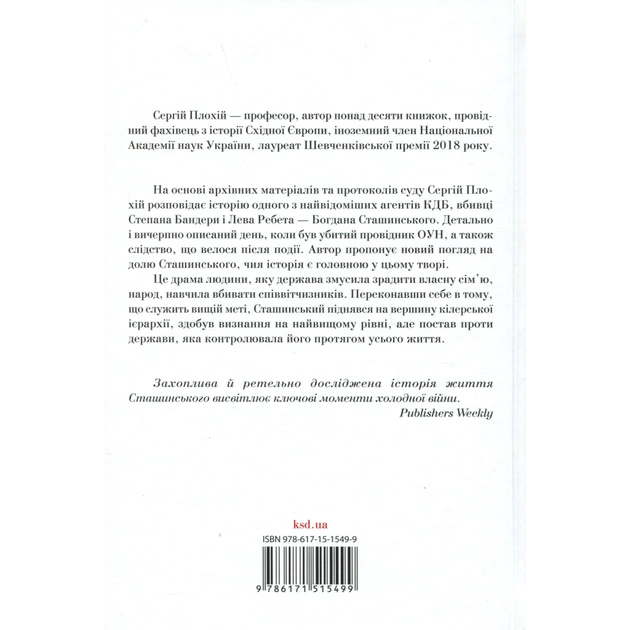 На основі архівних матеріалів та протоколів суду Сергій Плохій розповідає історію одного з найвідоміших агентів КДБ, вбивці Степана Бандери і Лева Ребета - Богдана Сташинського. Детально і вичерпно описаний день, коли був убитий провідник ОУН, а також слідство, що велося після події. Автор пропонує новий погляд на долю Сташинського, чия історія є головною у цьому творі.