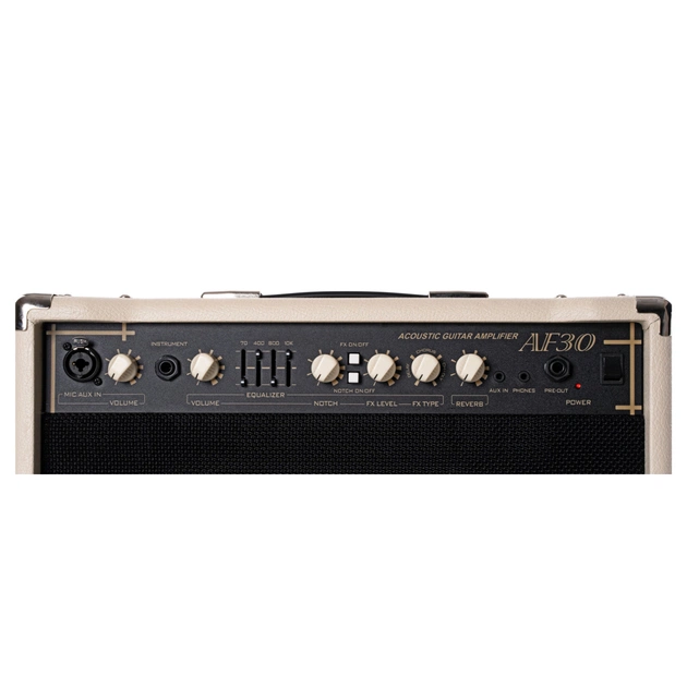 Cort AF30 здатний видати до 30 Вт вихідної потужності та має вбудовану DSP обробку. Крім цього підсилювачі серії AF отримали 4-смуговий графічний еквалайзер для точного формування звучання і обладнані режекторним Notch-фільтром для усунення акустичного зворотного зв'язку (feedback). Завдяки компактності AF30 стане ідеальним вибором для камерних виступів в невеликих приміщеннях або репетицій.