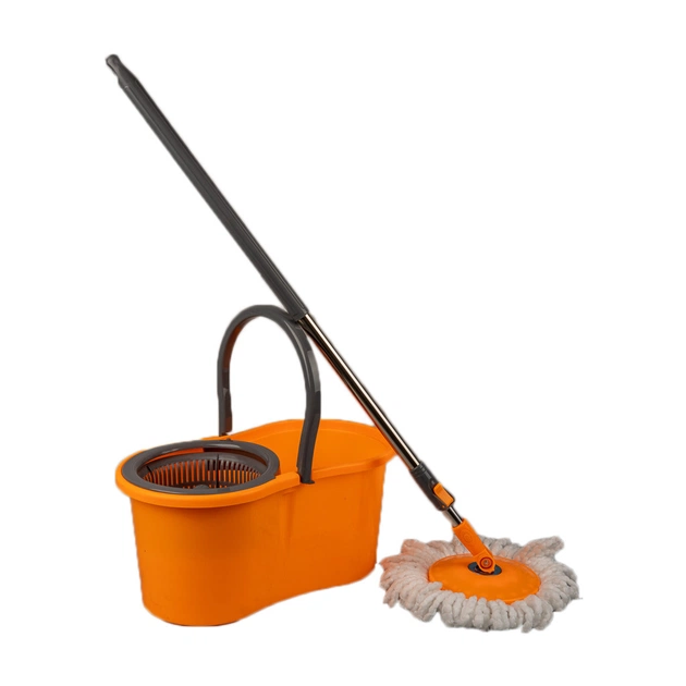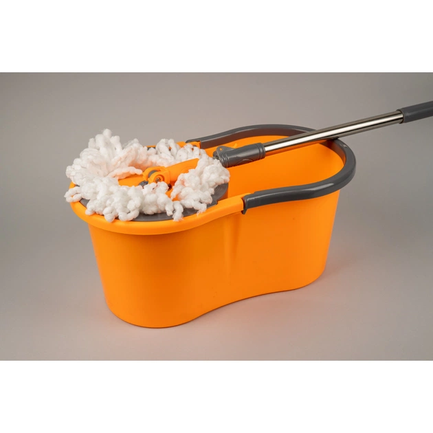 Комплект для прибирання складається з відра та швабри з насадкою для миття всіх видів підлогових покриттів. Швабра має телескопічну ручку та шарнір, який дозволяє обертатися на 360 градусів.