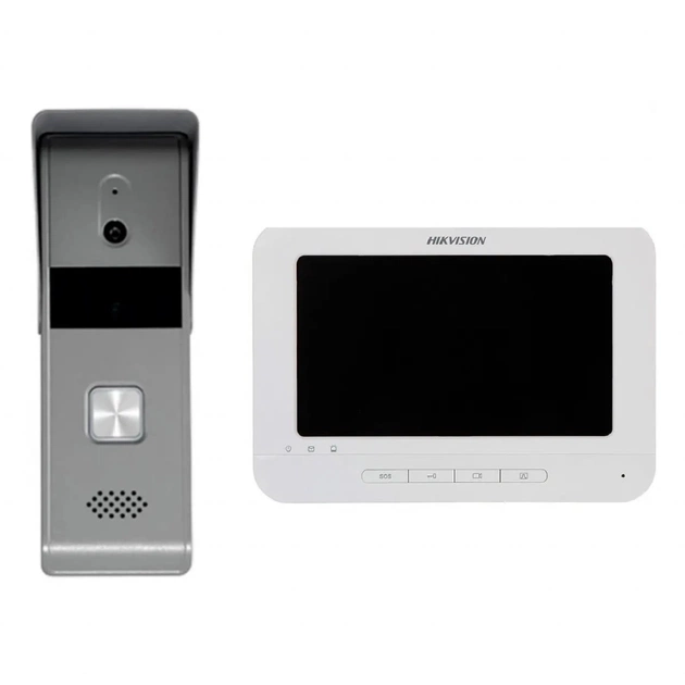 Hikvision DS-KIS203T — це вологозахищений комплект із викличної панелі DS-KB2421T-IM та відеодомофона DS-KH2220. У комплекті — монітор білого кольору, а виклична панель — сріблястого.