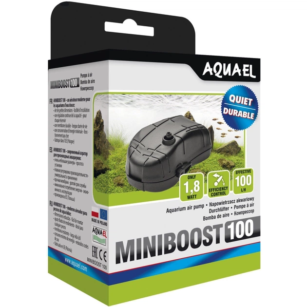 Аератор MINIBOOST 100 призначений для використання в малих і середніх акваріумах (об'ємом до 100 л). Прилад служить для ефективної аерації акваріумний води, а також може застосовуватися в якості приводу традиційних губчастих фільтрів (вживаних в даний час, головним чином, в акваріумах з креветками і мальками). Як ми вже згадували, аератор відрізняється дуже невеликими габаритами (всього 8,5x4x4 см), завдяки чому не кидається в очі і не займає багато місця.