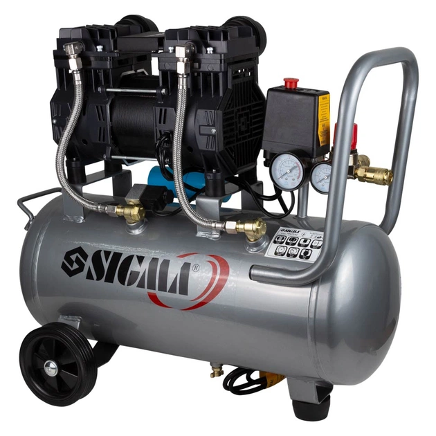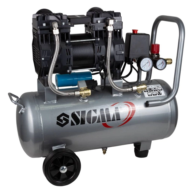 Компресор двоциліндровий безоливний 1.5 кВт 209 л/хв 8 барів 30 л SIGMA (7042541) призначений для нагнітання стисненого повітря з подальшим його поданням під тиском у різні типи пневмоінструменту. Ця модель компресора працює без оливи, тому не вимагає техобслуговування для контролю й доливання оливи. Вирізняється чистим повітрям, яке не містить будь-яких домішок. Колеса забезпечують стійке положення на поверхні, а гумова подушечка знижує рівень вібрації.
