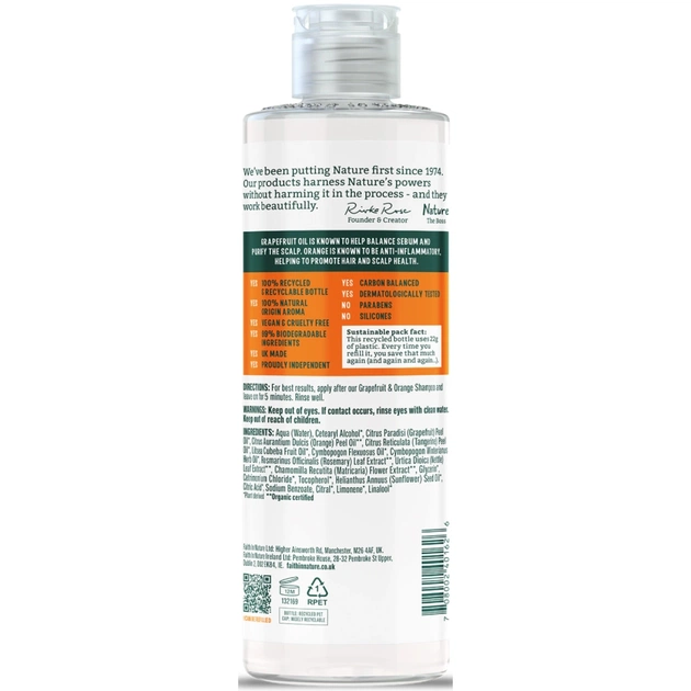 Наш очищувальний кондиціонер з грейпфрутом та апельсином спеціально розроблений для жирного волосся і шкіри голови. Як і всі наші кондиціонери, він на 99,5% складається з інгредієнтів натурального походження, не містить парабенів, лаурилсульфату натрію (SLS) і силіконів — та створений для того, щоб зробити волосся гладким і здоровим. Поки він вбирається у Ваше волосся, насолодіться яскравими та бадьорими ароматами органічного грейпфрута й апельсина, які відомі своєю властивістю заряджати енергією.