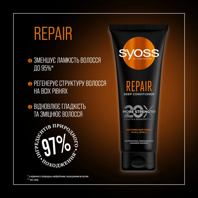 Інтенсивний кондиціонер SYOSS Repair розроблений з майстерністю відповідно до японських стандартів краси. Формула більш концентрована ніж у звичайних кондиціонерів, але менш насичена ніж в масках. Вона містить концентровані амінокислоти та екстракт водоростей вакаме для міцного та гладкого, до 20 разів сильнішого, волосся*.