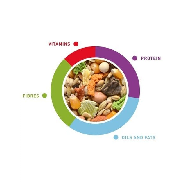 СКЛАД: злаки (ячмінь 15%), овочі (горох 9,5%), насіння, фрукти (виноград 1%, ананас 0,5%, яблуко 0,5%), барвники.