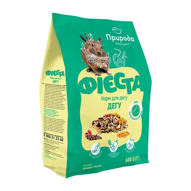 Квіти календули та ромашки, гречка, сушені овочі, пелюстки гібіскусу та горіхи забезпечують потреби дегу у вітамінах, потрібних для міцного здоров'я і довголіття, блискучого хутра та міцного імунітету. Завдяки герметичному пакованню корм зберігає приємний аромат і захищений від шкідливого впливу вологи