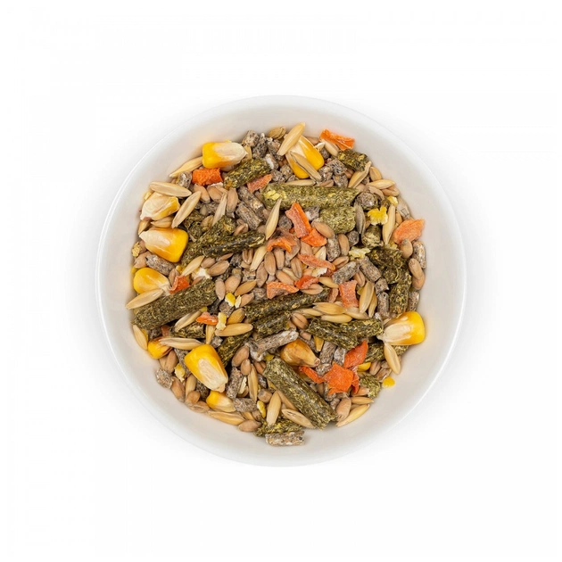 Склад: пшениця, трав’яне борошно гранульоване в асортименті, овес, кукурудзяні пластівці, комбікорм, сушена морква, ячмінь, насіння соняшнику, кукурудза.