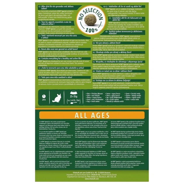 продукти рослинного походження (сіно тимофіївки 10%), зерно (кукурудза 6%), овочі (морква сушена 1%), екстракти рослинного білка, інулін 2,1%, олії та жири (ріпакова олія 1%), мінерали, екстракт юки Шидигера