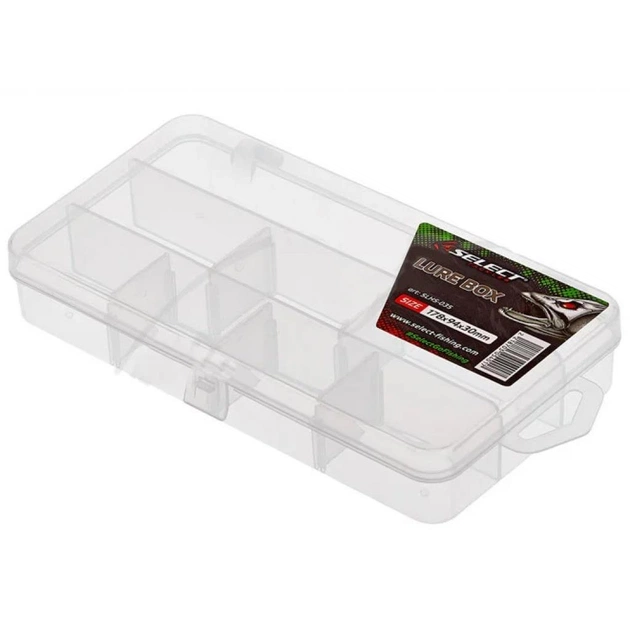 Коробка Select Lure Box максимально пристосована для зберігання приманок і рибальських аксесуарів. Для її виробництва використаний практичний пластик, що витримує деякі ударні навантаження і не вступає в реакцію з різними силіконами. Широкий асортимент моделей різних габаритів і комбінацій внутрішніх комірок, допоможе підібрати коробку для зберігання приманок практично будь-якого розміру.