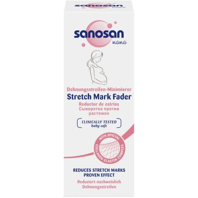 Sanosan Mama Сироватка від розтяжок і для підтягування шкіри із запатентованою формулою SynMat, на основі колагену й еластину, розроблена спеціально для боротьби з наявними розтяжками. Використання сироватки дає змогу зменшити візуальну видимість розтяжок на 21%, згладити шкіру на зонах їх утворення на 21% й істотно скоротити їх ширину на 26%. Гарантовано скорочує середньої глибини розтяжки на 72% після 2 місяців використання.
