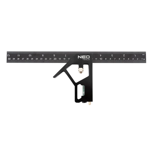 Кутник NEO 30 см, регульована алюмінієва рукоятка з високою точністю нахилу, латунна розмітка і гайка з накаткою, шкала в сантиметрах і дюймах, глибока шкала з гравіюванням, що не зношується, флакон в ручці.