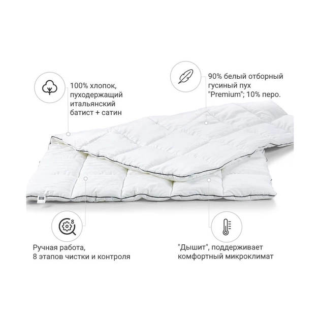 Наповнювач: добірний 100% елітний гусячий білий пух скандинавського гусака Екстра Преміум категорії. Показник Fill Power (показник пружності, ступеня відновлення пуху в ковдрі після стиснення) вагається в межах 700-750 з 800 можливих — один із найвищих і найкращих показників серед пухових наповнювачів.