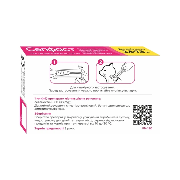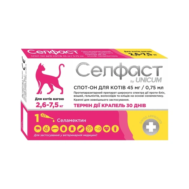 Селфаст Unicum - це протипаразитарний лікарський засіб, призначений для котів. Препарат широкого спектра дії проти бліх, вошей, гельмінтів, волосоїдів та кліщів на основі селемектину, що володіє широким спектром дії. Селфаст Unicum максимально безпечний для тварин (3 клас небезпеки), і в рекомендованих дозах не викликає місцево-дратівливого, резорбтивно-токсичного або сенсибілізуючого ефекту. Завдяки своїй високій безпеці і відсутності побічних ефектів у рекомендованих дозах, препарат є чудовим вибором для регулярного використання в лікуванні та профілактиці паразитарних захворювань. Забезпечте своїм улюбленцям здоров'я і комфорт, використовуючи Селфаст Unicum для підтримки їхнього благополуччя та захисту від паразитів.