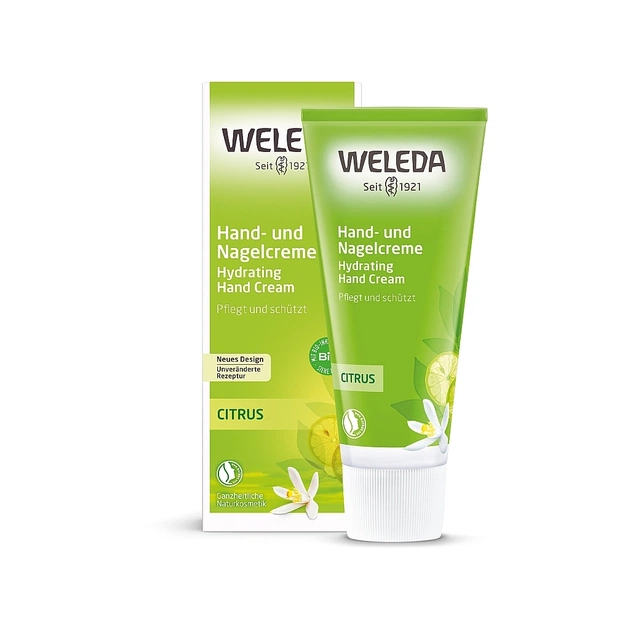 Крем Citrus Hand-und Nagelcreme від Weleda містить у складі натуральні екстракти розмарину, фіалки, календули і ромашки. Діючи разом з мигдальною олією, ці компоненти насичують шкіру важливими поживними мікроелементами, покращують обмінні процеси і кровообіг у тканинах, а також відновлюють природний баланс вологи у клітинах. Органічна олія цитрусових дарує шкірі тонус, пружність і гладкість, а також надає рукам чудового свіжого аромату. Завдяки густій консистенції продукт чудово живить сухі ділянки шкіри, пом'якшуючи їх уже через кілька хвилин після нанесення. Для комплексного лікування шкіри наносіть крем перед сном і залишайте на всю ніч, щоб нормалізувати стан тканин.