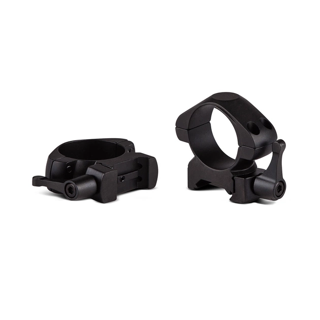 Монтажні кільця Ø 30 мм середньої посадки з важільним механізмом Quick Release. В екстремальній ситуації швидкознімна система дозволить за пару рухів зняти приціл з зброї. Кільця встановлюються на рейкову планку Вивера (Пикатинни), витримують віддачу навіть від серійної стрілянини.