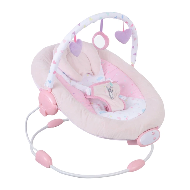 Іграшки на ігровій дузі привертають увагу малюка та спонукають до гри. Ніжні вібрації та мелодії (8) ще більше привертають увагу малюка. Регульований нахил спинки забезпечує комфорт вашій дитині. Bouncer має 3-точковий ремінь безпеки для безпечного використання.
